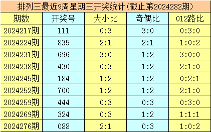 三、体彩排列三前9周星期三奖号分别开出:111-835-696-430-184-700-444-324-088,其中号码012路比为10:11:6,奇偶比为10:17,大小比为9:18;