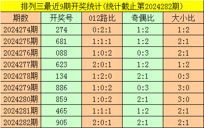 一、排列三第2024282期开出号码905,其奇偶比为2:1,大小比为2:1,号码012路比为2:0:1。该号码直选历史上出现了11次。
