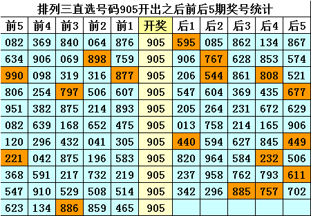 四、排列三直选号码905历史上开出11次,其前后五期奖号分别为: