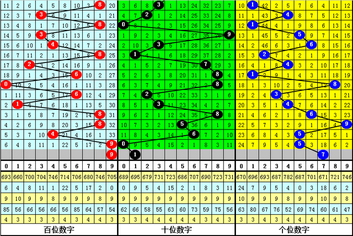 末位跨度分析:前3期末位奖号为9-5-5,最近两期末位奖号跨度为4、0,末位奖号跨度历史上连续两期开出4、0的现象共69次,其最近两次奖号为:
