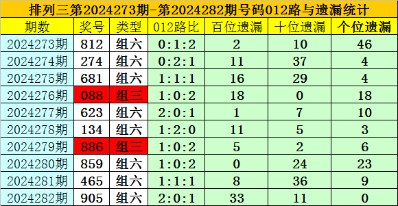 开奖回顾:排列三第2024282期奖号为:905,类型为组六,号码012路比为2:0:1,百十个位号码直选分别遗漏33期、11期和0期。