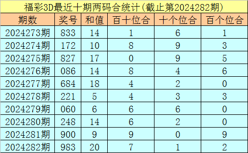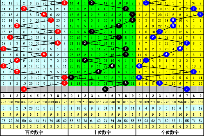 百个位合:前10期百个位两码合开出:1、3、5、6、0、3、0、0、9、2,其中百个位两码合012路比为7:1:2,奇偶比为5:5,本期看好百个位两码合开出0路号,参考两码合0、3、6。