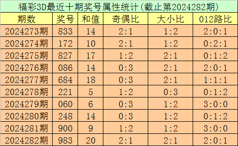 开奖回顾:第2024282期福彩3D奖号为983。奖号形态为组六,大小比为2:1,和值为20,奇偶比为2:1,012路比为2:0:1,跨度为6。