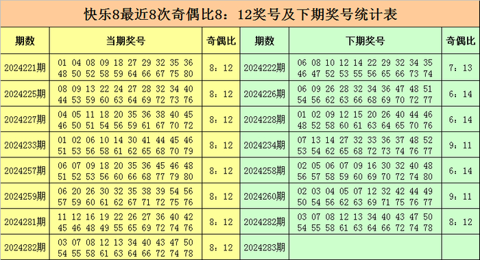福彩快乐8第2024282期开奖回顾:03 07 08 12 13 34 40 43 47 50 54 55 58 61 63 64 66 72 74 78,其中奖号奇偶比为8:12,大小比为13:7,012路比为7:9:4。