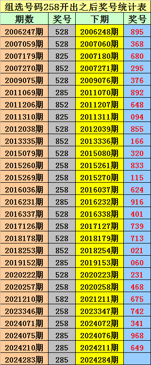 排列三组选258出现之后下期分别开出:895、368、680、295、376、892、648、094、855、166、320、833、115、624、916、401、739、713、021、060、231、468、675、742、341、968、649。