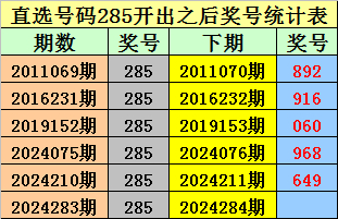 排列三直选285出现之后下期奖号分别为:892-916-060-968-649。