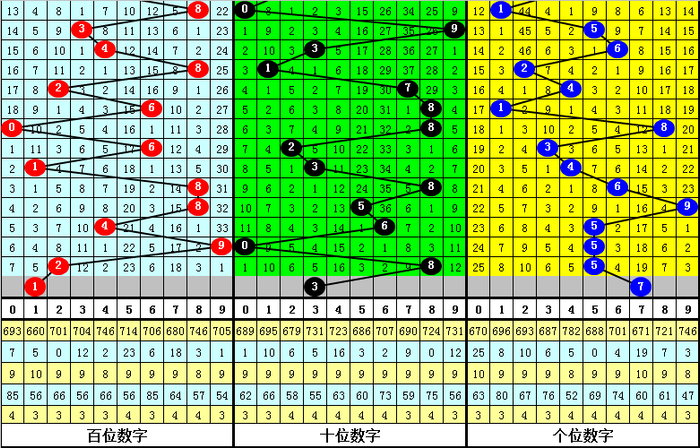 百位:下期百位1路号码开出次数较少,出现了3次,本期看好该位1路号码逐渐回补,参考号码1。