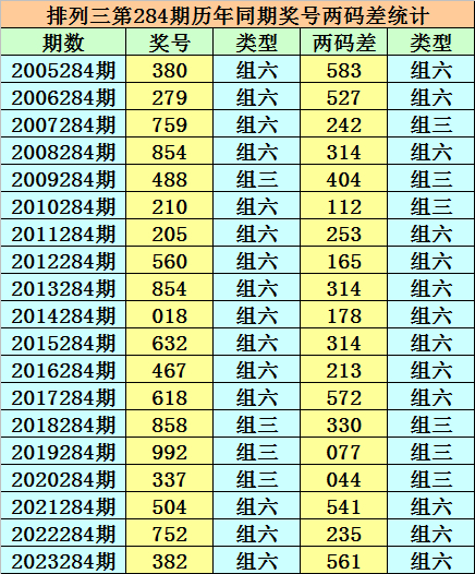 在排列三第284期历史同期开奖中,各号码两码差分别为:358、257、224、134、044、112、235、156、134、178、134、123、257、033、077、044、145、235、156;