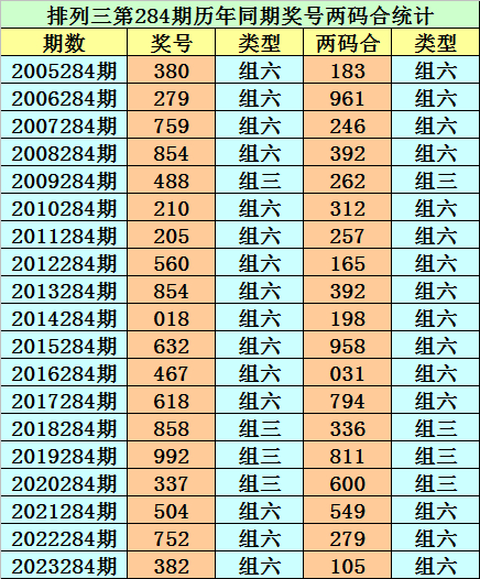 排列三从2004年开奖至今已开出7055期奖号了,其中第284期历史同期奖号出现19次,历年第284期分别开出号码:380、279、759、854、488、210、205、560、854、018、632、467、618、858、992、337、504、752、382。