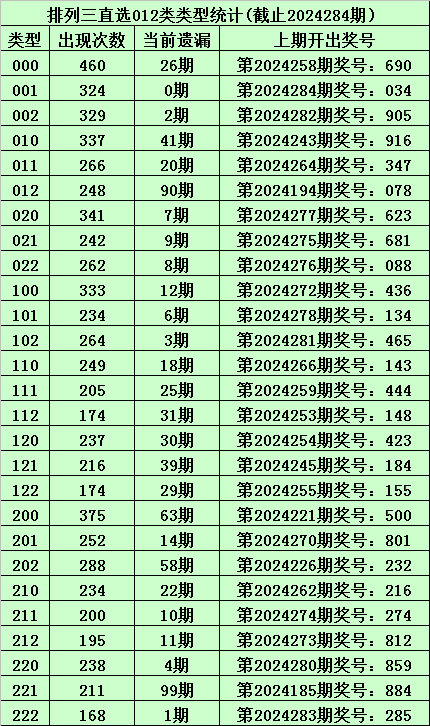 排列三上期开出奖号为:034,其直选012路类型为001,历史上直选001号码已开出了324次,最近11期分别开出奖号为:667、397、697、667、631、604、997、991、031、367、034。
