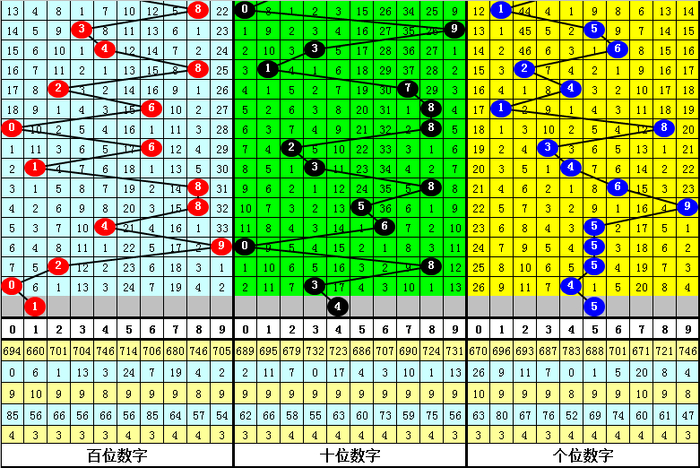 在以上统计中奖,直选001组合之后,下期奖号百位开出号码:0245789,未开出号码136,其中百位号码奇偶比为4:6,012路比为2:2:6,大小比为6:4,本期预计百位出现奇数号码,精选一码1。