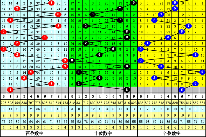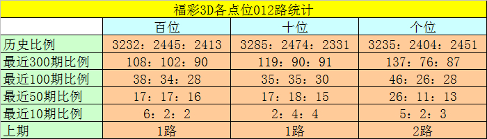 百位分析:该位最近10期开出了6个0路号码、2个1路号码、2个2路号码,0路号码热出。本期排除2路号码,参考号码:1。