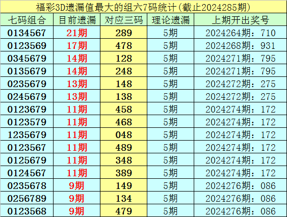 福彩3D七码遗漏组六分析(第2002001期-第2024285期)