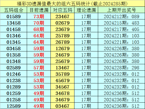 1.截止第24285期,五码组六遗漏最大的是:01589,当前遗漏73期。