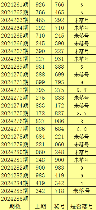 福彩3D第2024285奖号718,重号未落号。在最近100期(第2024186期-2024285期)中,重号落号54期;最近20期重号落号概率为45%;最近10期重号落号概率为50%。本期防重号中号码轮空。