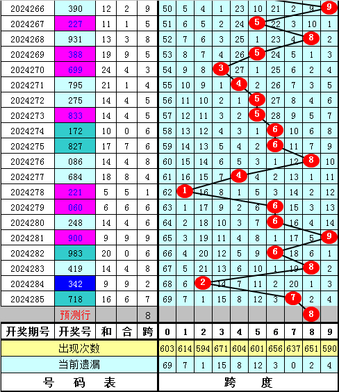 福彩3D第2024285期最大跨度开出7,近期最大跨度波动较大,本期预计最大跨度在5-9区段开出,最大跨度参考6789,一码跨度参考8。