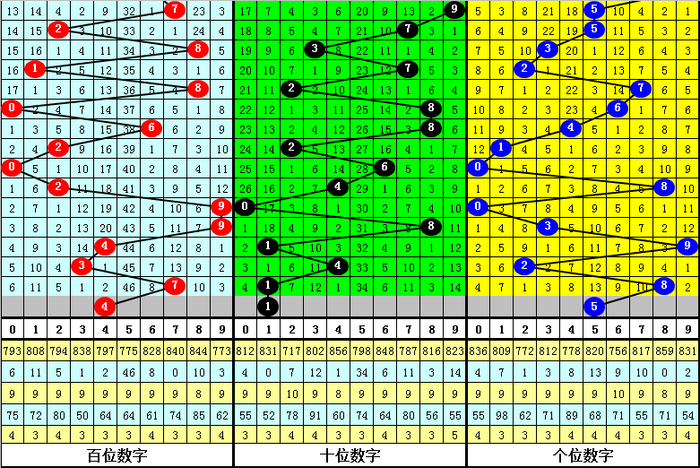 2、组选号码012路比为41:43:68,其中0路号码轮空13期,1路号码轮空15期,2路号码轮空9期,本期012路比参考0:2:1组合。