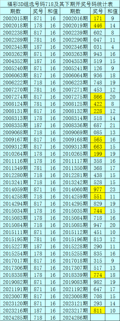 二、组选分析:历史上组选号码718开出了43次,其下期奖号分别为:171-446-602-047-031-943-519-126-936-748-453-866-422-228-518-687-085-565-663-199-358-368-438-528-977-551-829-744-718-947-451-813-290-835-315-517-774-982-647-708-293-811,其开出期数和下期奖号统计为: