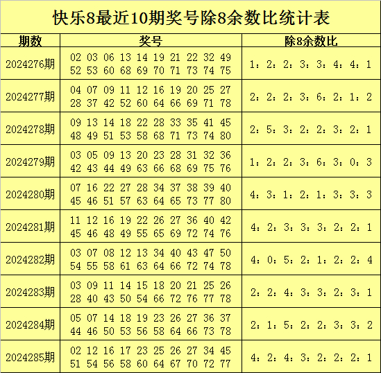 福彩快乐8第2024285期开奖回顾:02 12 16 17 23 25 26 27 34 45 51 54 56 58 60 64 67 70 72 77,其中奖号除8余数比为4:2:4:3:2:2:2:1。