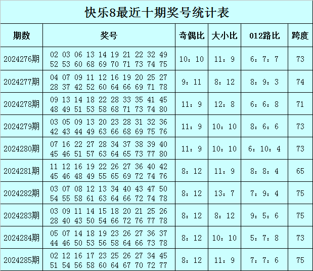 福彩快乐8第2024285期开奖回顾:02 12 16 17 23 25 26 27 34 45 51 54 56 58 60 64 67 70 72 77,其中奖号奇偶比开出8:12,大小比开出11:9,012路比开出7:7:6,和值为856,跨度为75。