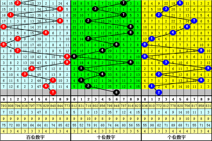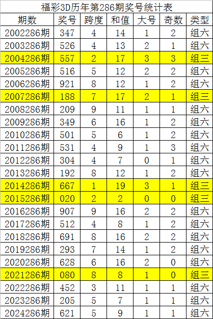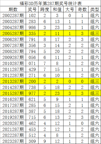 从以上统计可以看出,历年3D第287期开出了3次组三号码,开出了19次组六号码。组六号码出现概率大,本期预计开出组六号码。