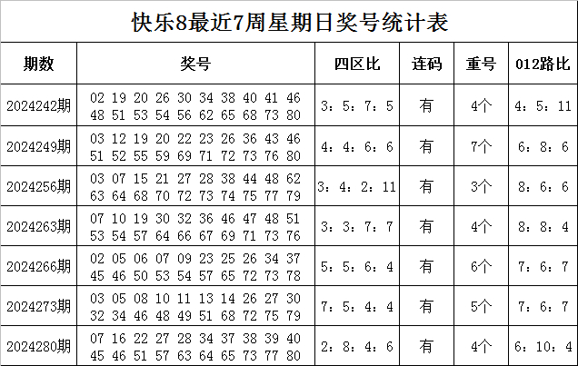 福彩快乐8第2024280期(上周日)奖号回顾:07 16 22 27 28 34 37 38 39 40 45 46 51 57 63 64 65 73 77 80,其中奖号四区比为2:8:4:6,012路比为6:10:4,包含4个重号27、34、46、51,包含连码27 28、37 38 39 40、45 46、63 64 65。