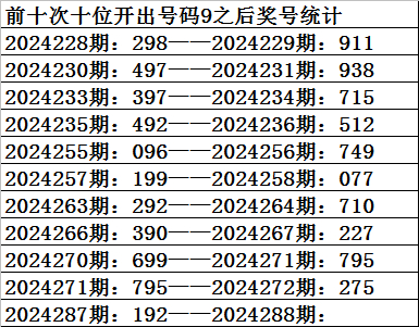 三、十位分析:上期开出号码9,前10次号码9出现之后下期同位号码为:1311471297,其中号码大小比为3:7,大号走势相对较冷;奇偶比为8:2,偶数号码走势相对较冷;012路比为2:7:1,2路号码走势相当冷。本期参考号码:8。