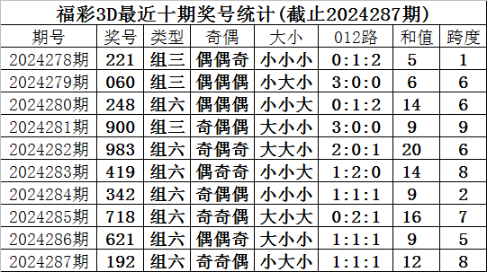 开奖回顾:福彩3D第2024287期奖号为192,奖号形态为:组六、小大小、1:1:1、奇奇偶。