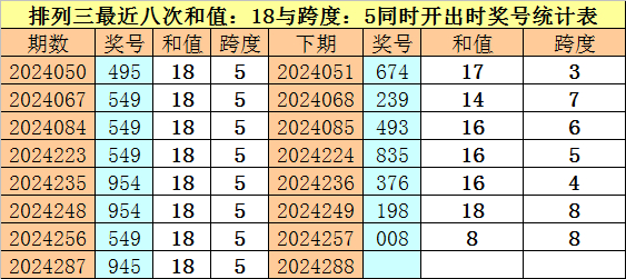 开奖回顾:体彩排列三第2024287期奖号为:945。和值为:18,跨度为:5。