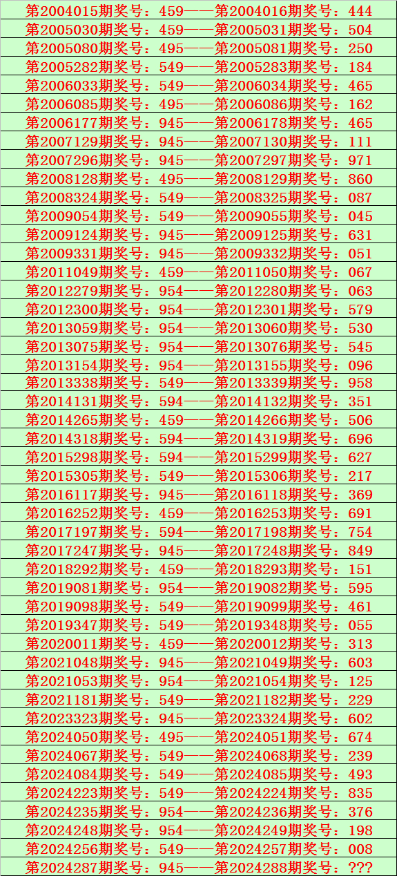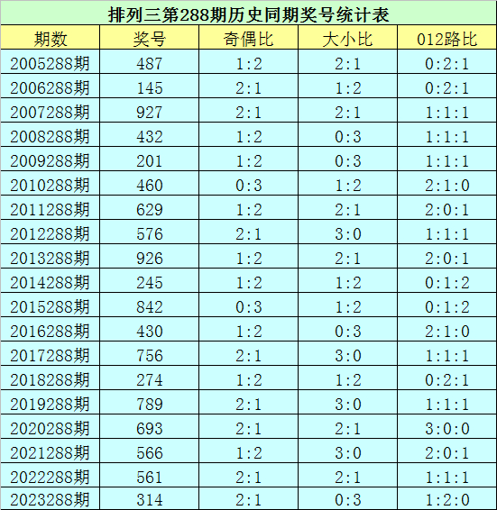 排列三第2024288期开奖日期:2024年10月28日,历史上第288期已开出了19次奖号,历年同期号码分别为:487、145、927、432、201、460、629、576、926、245、842、430、756、274、789、693、566、561、314。