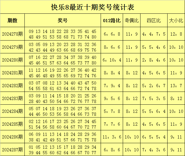 福彩快乐8第2024287期开奖回顾:01 05 12 13 15 17 18 28 29 34 39 44 55 60 62 64 66 67 70 77,其中奖号012路比为6:8:6,四区比为7:4:3:6奇偶比为10:10,大小比为9:11。