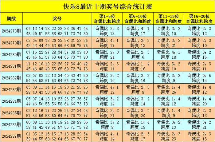 福彩快乐8第2024287期开奖回顾奖号:01 05 12 13 15 17 18 28 29 34 39 44 55 60 62 64 66 67 70 77,其中奖号奇偶比为10:10,大小比为10:10,跨度为76。