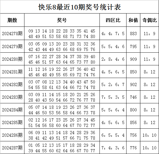 快乐8历史开奖至今已开出了1405期奖号了,上期奖号四区比为7:4:3:6,历史上四区比7:4:3:6共出现了10次。