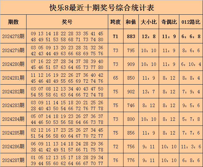 福彩快乐8第2024287期开出奖号:01 05 12 13 15 17 18 28 29 34 39 44 55 60 62 64 66 67 70 77,其中奖号跨度开出76,和值开出776,大小比开出9:11,奇偶比开出10:10,012路比开出6:8:6。