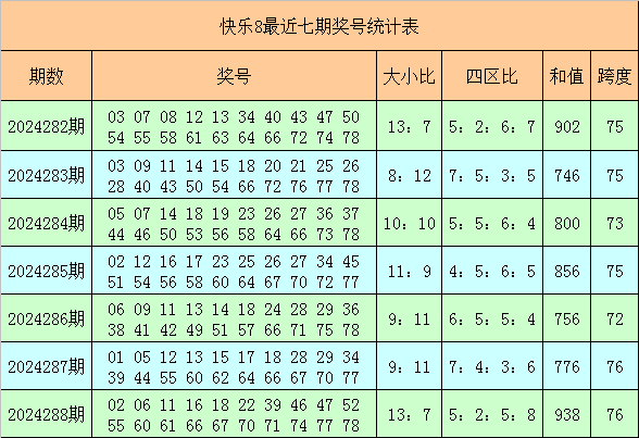 福彩快乐8第2024288期开出奖号:02 06 11 16 18 22 39 46 47 52 55 60 61 66 67 70 71 74 77 78,其中奖号大小比为13:7,四区比为5:2:5:8,和值为938,跨度为76。