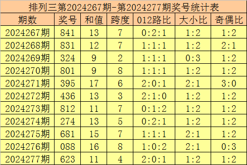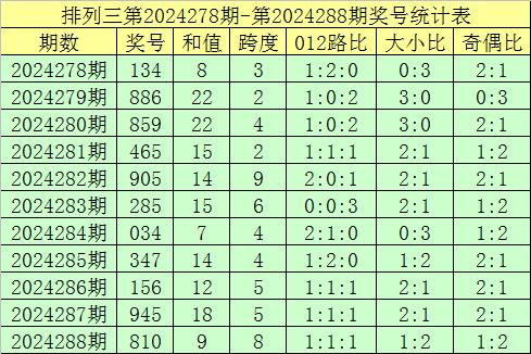 开奖回顾:排列三第2024288期奖号开出:810,组选类型:组六,大小比为1:2,奇偶比为1:2,和值为9,跨度为8。
