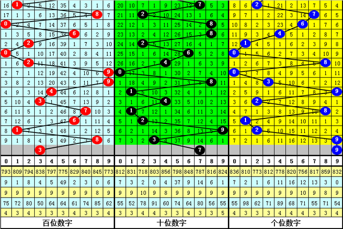 百位上期开出号码8,上升7点位,本期注意该位下降,参考号码3。