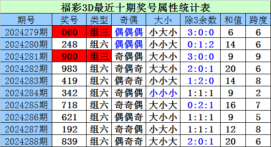 上期回顾:上期开奖奖号为839,类型:组六,偶奇奇,大小大,2:0:1,和值20,跨度6。