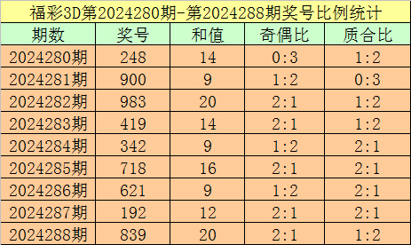 开奖回顾:福彩3D第2024288期:奖号为839,奖号质合比为1:2,大小比为2:1,跨度为6,类型为组六。