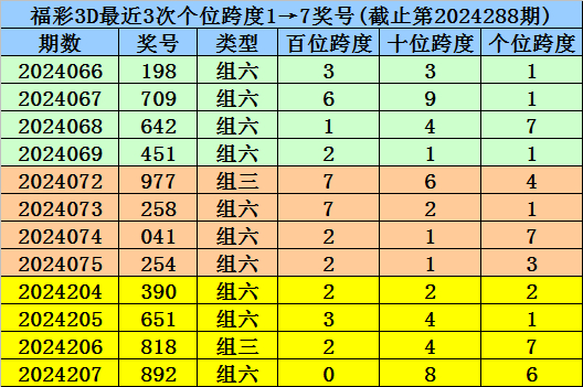 第2024204-第2024206期奖号:390、651、818,其下期奖号为:892,末位号码跨度为0;