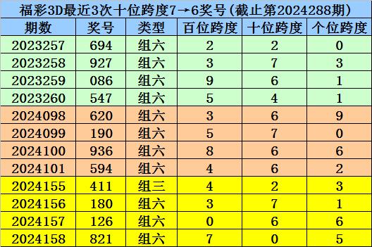 首位跨度分析:首位号码最近3期奖号为6-1-8,连续两期跨度为5、7,历史上首位号码连续两期分别开出跨度5、7的现象共出现43次,其前两次开出奖号分别为:
