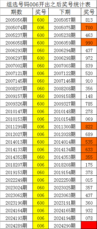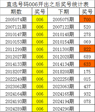 从上表统计可以看出,直选号码006开出之后,其下期奖号: