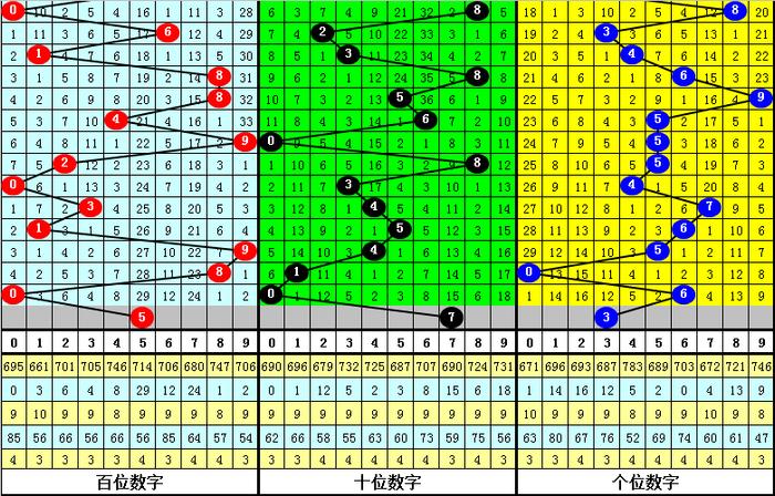 百位号码奇偶比为4:8,奇数走势较冷,本期看好奇数出现;大小比为6:6,基本相当,本期看好开出大号。