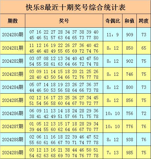 福彩快乐8第2024289期开奖回顾奖号:03 12 13 16 21 38 44 46 50 51 54 62 63 68 69 70 74 76 77 78,其中奖号奇偶比为7:13,和值为985,跨度为75。