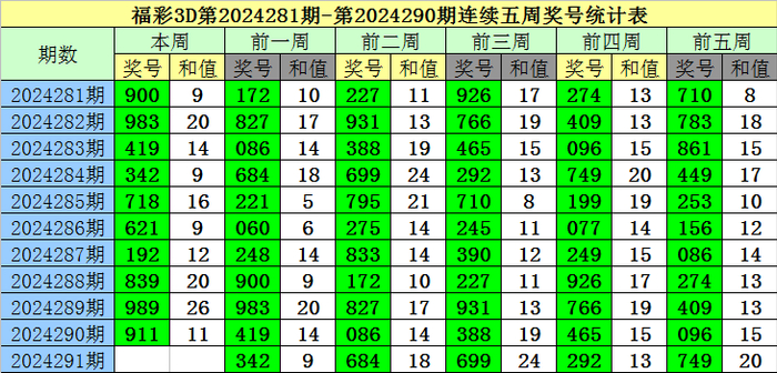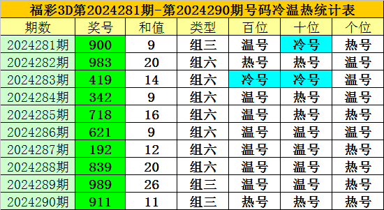 上期回顾:福彩3D第2024290期开奖奖号为:911,奖号类型为:组三,奖号冷温热态为:热号+热号+热号。
