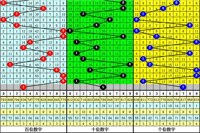 百位上期出现:热号9,该位连续十期以温号出现较多,以冷号出现较少,本期该位温号有4个:0、2、3、4,看好温号转热,关注号码3。