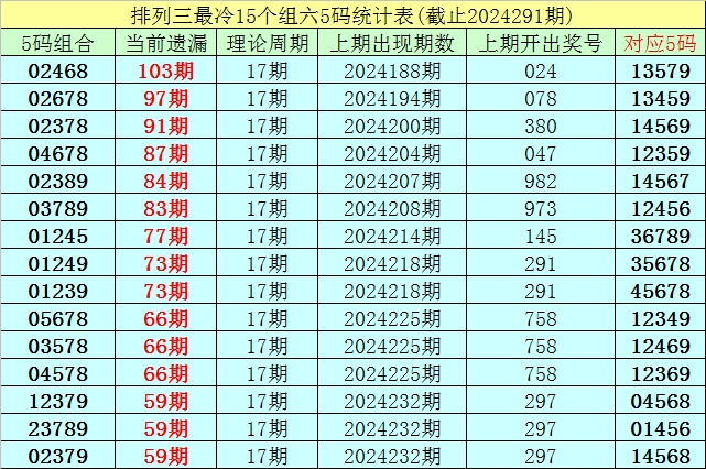 (4)排列三第2024291期遗漏值最大的十个5码组六组合解冻了0个;
