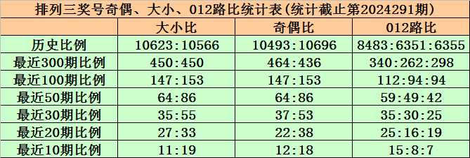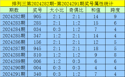上期回顾:排列三第2024291期出现奖号340。开出组六,奇偶比1:2,012路比2:1:0,大小比0:3,和值7,跨度4。