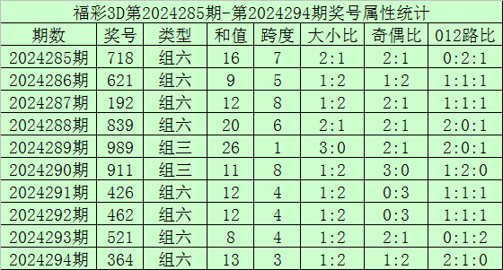 开奖回顾:福彩3D第2024294期开奖号:364,其中奖号和值:13,奇偶比1:2,大小比1:2。