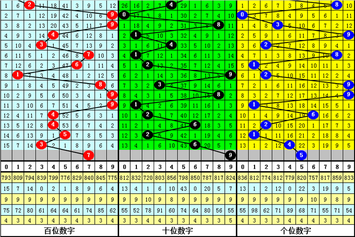 和值走势:最近10期和值走势为:(16)→(9)→(12)→(20)→(26)→(11)→(12)→(12)→(8)→(13),和值升降平次数比为6:3:1,上期和值上升5个点位,本期预计和值继续上升,参考和值21。